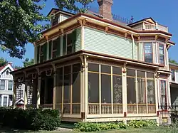 The Thomas Murray House is typical of the Italianate style houses that were being built in Davenport after the American Civil War.[2] It forsakes the simplicity of Greek Revival decorative elements that were found in earlier Italianate houses for the verticality and millwork embellishment of the Victorian expression. The house features a square form, hipped roof with deck, roof cresting, projecting side pavilions, and a prominent bracketed wrap-around porch. The cornice has brackets and a scalloped motif that is applied to the frieze.
