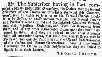 In 1728 Prince began work on a A Chronological History of New England, in the Form of Annals, a history of New England beginning with the 6th day of creation. He became interested in such a project after, during his travels, he found 'the want of a regular history of this country everywhere complained of' and in an effort to preserve the contents of various texts, some of which by then had already been destroyed.[1] This was such a momentous project that it took him until 1736 to finish the first volume, which covered events up to September 7, 1730 and had to be cut short after the publisher informed him that the book was becoming too large to be effectively published. The volume had poor sales, which is attributed to the lack of need for a text of such detail at that time and the lack of interest in a text 'written for a higher purpose than to amuse its reader'.[2] Despite the lack of interest in the text Prince continued to work as a second volume, releasing it in three parts going up to 1733, each costing sixpence. Due to lack of further interest in the text this format was discontinued.[3] Prince's work is noted for its accuracy, with Prince saying that “I cite my vouchers to every passage, and I have done my utmost, first to find out the truth, and then to relate it in the clearest order. I have laboured after accuracy; and yet I dare not say that I am without mistake; nor do I desire the reader to conceal any he may possibly find.”[3]