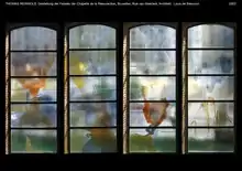 In 1999, Reinhold got the assignment of designing the windows of the Chapel of the Resurrection, Rue van Maerlant in Brussels, which he completed in 2002 in cooperation with the glass painting manufactory Schlierbach, Austria.[6] As a result of the fusion technique used in the windows' production, their transparency provides a 'display model' of visual depth, the superimposition of different layers, and the relationship between coexistence and sequence. This allows the viewer to reflect on his or her own position. Looking out, the transitional coloured layer merges with the facades of the European government buildings opposite, while trees, an expanse of lawn, passing cars and people contribute their shapes and colours to a background layer of reality and add to the view as a whole.