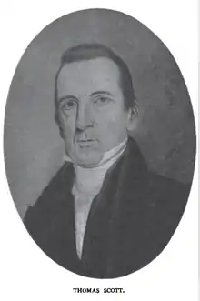 Thomas Scott was born at Oldtown, Frederick (now Allegany) County, Maryland.[2] At age eighteen, he was ordained to preach in the Methodist church and, in 1793, was placed in charge of the Ohio circuit. In May 1796, he married Catherine Wood.[3] He learned the art of tailoring, and studied law under James Brown of Lexington, Kentucky. He practiced in Flemingsburgh, Kentucky, in 1799 and 1800.[3]