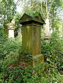 Skinner was buried on Monday 12 December 1881 in a vault at "the centre of the upper portion of the churchyard" at All Saints Church, Ecclesall.[35] The plot has a "handsome monolithic column" which bears the inscription, "In affectionate remembrance of Mellond, the beloved wife of Thomas Skinner who departed this life Nov 24th 1876 aged 56 years. Also the above Thomas Skinner who departed this life Dec 6th 1881 aged 62 years."[10] Burial records are in Sheffield Archives.[11] On the day of the funeral a "large crowd" assembled outside Skinner's house, to see the polished oak coffin with "Thomas Skinner, aged 65" (sic) engraved on it. Two coaches containing relatives of Skinner, and Jane Jones, followed the coffin to the church, and after them walked "fifty or sixty persons, mostly of the fairer sex". The service was taken by Reverend Sandford.[nb 4] Most of the mourners "wept bitterly" as they proceeded from the funeral service to the burial place. "The clergyman uttered the closing words of the burial service in a downpour of hail and rain."[11]