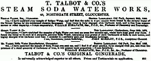 Thomas Talbot was born in Portsea, Hampshire, in 1819 to Thomas and Maria Talbot.[1] He had a sister Eliza who became a governess.[2] He married Ann Ratcliffe Buston or Burton in Gloucester in 1845.[3][4] In the 1851 census he was shown as a "Soda water manufacturer and grocer" at 45 Lower Northgate Street.[2] He had daughters Amelia and Ann, and sons Thomas and Edward.[5] In the 1881 census he was shown as a "Mineral Water Manufacturer Master Employ 9 Men 4 Boys" residing at 4 Commercial Road.[6]