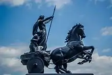 Thornycroft also worked on a monumental representation of Boadicea and Her Daughters,[2] exhibiting a "Colossal head of Boadicea, a part of a chariot group now in progress" in 1864.[9] A short biography published that year said he had already been working on it "at intervals" for many years.[3] The sculpture was not cast in bronze until 1902, 17 years after his death,[2] when it was installed on plinth on the Victoria Embankment, by Westminster Bridge, London.[10] The figures are shown in a chariot with scythed wheels, drawn by two horses.[10]