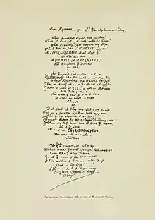 Given Traherne's calling and piety, many modern settings of Traherne's work have a devotional context. His poem "The Rapture" was included in the Cambridge Hymnal (1967) as Hymn 97, with music by the composer William Wordsworth.[67] Also among the largely sacred choral music of Patrick Larley has been his On Christmas Day (2002), a sequence of seven pieces, of which numbers 1, 3 and 7 incorporate verses from Traherne's poem "On Christmas-Day".[68][69] Several other pieces were commissioned for special occasions: from Colin Matthews ("Shadows in the water", 1978/9);[70] Francis Jackson ("On Christmas Day", 1995);[71] John Casken ("A song of Chimes", 1996); Andrew Carter ("The saints of God", 2005);[72] Cecilia McDowall, ("The skies in their magnificence", 2008);[73] Francis Pott, ("The love of God is in eternity", 2011);[74] and David Sawer, ("Wonder", 2012).[75]