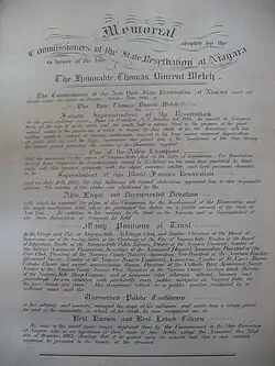 Niagara Falls, New York was not always as we know it today. In the mid-19th century, heavy industries and mills crowded the shoreline near the falls, in order to take advantage of free power. These mills charged fees for visitors to view the falls, which were largely obstructed.[1] A group of concerned citizens, politicians, and architects - including T.V.Welch - started the "Free Niagara" movement. When the bill making Niagara Falls free was signed on April 30, 1885, it was the culmination of a campaign in the New York State Legislature spearheaded by Thomas V. Welch. His efforts, and those of everyone involved, are documented in a pamphlet entitled How Niagara Was Made Free,[2] which was published by the Niagara Frontier Historical Society, and in the annals of New York State.