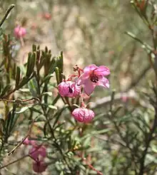Thomasia is a genus of thirty-one species of flowering plants in the family Malvaceae. Plants in this genus are small shrubs that are endemic to the south-west of Western Australia, apart from T. petalocalyx that is native to Victoria and South Australia. The leaves are simple with leaf-like stipules at the base of the petiole, the flowers bisexual with five papery, petal-like sepals, usually five petals and five stamens opposite the petals. The fruit is a capsule covered with star-like hairs.[2][3][4]