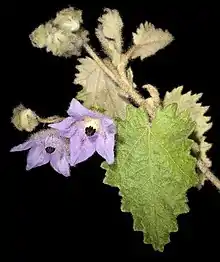 Thomasia macrocarpa is a small, spreading shrub growing to about 1.5 m (4 ft 11 in) high and 1 m (3 ft 3 in) wide. The stems are hairy, the grey-green leaves 30–120 mm (1.2–4.7 in) long and 15–70 mm (0.59–2.76 in) wide with finely toothed margins and star-shaped hairs. The leaves are heart to egg-shaped, velvety when young and become smooth as they age. The conspicuous pink to purple flowers are produced between August and November in the species' native range. Occasionally white flowers are seen. The flowers are about 10 mm (0.39 in) in diameter with a perianth consisting of two bracts and the pedicel 7–15 mm (0.28–0.59 in) long. The flower petals are small lobes and the surface is covered in star-shaped hairs. The flowers are followed by capsules containing black seeds which are shed from the plant when ripe.[2][3]