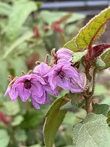 Thomasia paniculata is a spreading shrub that typically grows to 0.3–2 m (1 ft 0 in – 6 ft 7 in) high and 1.0–1.5 m (3 ft 3 in – 4 ft 11 in) wide, its new growth densely covered with star-shaped hairs. The leaves are heart-shaped to narrowly egg-shaped, 30–100 mm (1.2–3.9 in) long and 8–20 mm (0.31–0.79 in) wide on a petiole 8–13 mm (0.31–0.51 in) long with rounded to wing-like stipules at the base of the petioles. The edges of the leaves are regularly notched and both sides are covered with scattered star-shaped hairs. The flowers are up to 13 mm (0.51 in) in diameter and arranged in racemes of 3 to 8 on a peduncle up to 80 mm (3.1 in) long. Each flower is on a pedicel 3–5 mm (0.12–0.20 in) long with densely hairy, linear bracts and similar bracteoles 4–8 mm (0.16–0.31 in) long at the base. The sepals are pinkish-mauve, densely covered with star-shaped hairs and joined for about half their length. Flowering occurs from September to December or from January to March.[2][3]