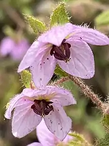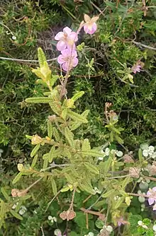 Thomasia petalocalyx is a shrub that typically grows to 0.5–1.5 m (1 ft 8 in – 4 ft 11 in) high, 0.5–2 m (1 ft 8 in – 6 ft 7 in) wide and has its new growth covered in star-shaped hairs. The leaves are oblong to egg-shaped, 20–40 mm (0.79–1.57 in) long and 5–13 mm (0.20–0.51 in) wide on a petiole 2–8 mm (0.079–0.315 in) long with hairy brown, wing-like stipules 8–12 mm (0.31–0.47 in) long at the base of the petioles. The leaves are covered with star-shaped hairs, and the edges are wrinkled, turned down and finely toothed. The flowers are arranged singly or in racemes of up to 5 on a red peduncle 30–40 mm (1.2–1.6 in) long near the ends of the branches. Each flower is on a pedicel 6–8 mm (0.24–0.31 in) long, with 3 bracteoles 5–6 mm (0.20–0.24 in) long at the base. The sepals are mauve and form a cup-shaped flower 10–15 mm (0.39–0.59 in) wide, the petals deep red and tiny.[2][3][4][5]