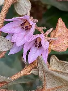 Thomasia triphylla is a small shrub that is endemic to the south-west of Western Australia. The flowers are pinkish-purple, bell-shaped and hang in pendents from the leaf axils.