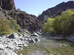 The creek provides habitat for as many as 22 fish species according to a 1982 study, including Sacramento pikeminnow, Sacramento sucker, hardhead, California roach and speckled dace. The creek is host to significant runs of steelhead trout, as well as resident populations of rainbow trout (landlocked steelhead) above the waterfalls in the Gorge which form partial barriers to fish passage.[15] The creek is also home to spring-run chinook salmon.[16]