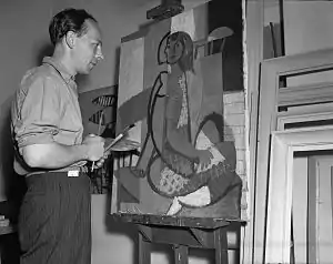 Between 1947-1948, he performed the decorations for the Aker Town Hall (Akers herredshus). Located at Trondheimsveien 5, the building features his motif Fossen, a designed inspired by the Akerselva which flows through Oslo. Among his other notable works are the painting Rød figur i blå sofa from 1950 and the triptykon Palestina-trio from 1973–79. The Norwegian Museum of Contemporary Art has acquired twenty of his works. He is represented at the National Gallery in Oslo as well as at Bergen Billedgalleri, Trondheim Kunstmuseum, Llllehamrner Kunstmuseurn and Rogaland Kunstmuseum. Internationally his work is featured at the National Gallery of Denmark, Gothenburg Museum of Art and Stockholm City Museum.[4][5][6]