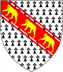 Arms of Cooke: Ermine, on a bend cotised gules three cats-a-mountain passant guardant or[10]