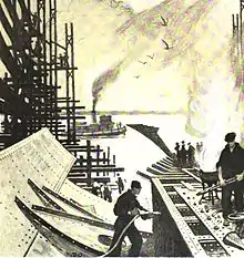 During World War I, lithographs of his patriotic drawings of war work at the shipyard at Hog Island, Philadelphia were distributed by the United States government. In 1938–1939 he did six 12-foot mural panels for the Franklin Institute in Philadelphia on epochs in science. During World War II he did three sets of pictures of the war effort for National Geographic Magazine in 1942, 1943, and 1945.[8] After the war he was commissioned to paint industrial subjects for the Pennsylvania Railroad, the Philadelphia Electric Company, Sun Oil, and other industries.