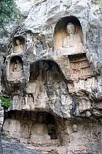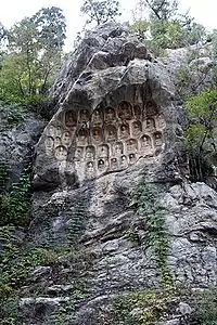 The Thousand-Buddha Cliff (Chinese: 千佛崖; pinyin: Qiānfó Yá) is a historical site of mostly Tang dynasty rock carvings in central Shandong Province, China. Along a cliff face of 63 meters length, over 210 statues and 43 inscriptions have been reported.[1] Most of the statues were carved during 618–684.[1]