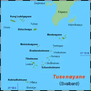 Thousand Islands[1][2][3] (Norwegian: Tusenøyane) is a group of small islands south of Edgeøya. They form part of the Svalbard archipelago. The group consists of over forty islands and islets, including Brotskjer, Kulstadholmane, Utsira, Tufsen, Kong Ludvigøyane, Bölscheøya, Hornøya, Tiholmane, Meinickeøyane, Sletteøya, Schareholmane, Skråholmen, Brækmoholmane, Tareloppa, Vindholmen, and Menkeøyane.