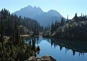 The Alpine Lakes Wilderness features some of the most rugged topography in the Cascade Range with craggy peaks and ridges, deep glacial valleys, and granite walls spotted with over 700 mountain lakes.[5] Geological events occurring many years ago created the diverse topography and drastic elevation changes over the Cascade Range leading to the various climate differences. These climate differences lead to vegetation variety defining the ecoregions in this area. The elevation range of this area is between about 1,000 feet (300 m) in the lower elevations to over 9,000 feet (2,700 m) on Mount Stuart.[6]