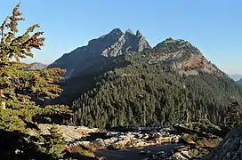 Three Queens is a prominent 6,687 ft (2,040 m) triple-summit mountain located in the Cascade Range, in Kittitas County of Washington state.[4] It is set within the Alpine Lakes Wilderness on land managed by Wenatchee National Forest. The East Peak is the highest, and its subpeaks are the Middle Peak (6,600 ft; 2,000 m), and West Peak (6,400 ft; 2,000 m).[1] Three Queens is set 6.5 miles (10.5 km) east-northeast of Snoqualmie Pass, on Chikamin Ridge, 2.76 miles (4.44 km) southeast of its nearest higher neighbor, Chikamin Peak. The Pacific Crest Trail traverses the west slope of Three Queens as it crosses the gap between Four Brothers and Three Queens. Precipitation runoff from the mountain drains into tributaries of the Yakima River drainage basin. The first ascent was likely made in 1925 by a party of eight Mountaineers led by Glen Bremerman and C. A. Fisher.[2] This mountain's name was officially adopted in 1940 by the United States Board on Geographic Names.[4]