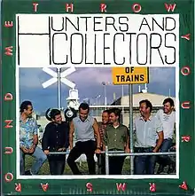 Hunters & Collectors had formed in 1981 with Mark Seymour (guitar, vocals), John Archer (bass guitar), Doug Falconer (drums) Geoff Crosby (keyboards), Greg Perano (percussion), Ray Tosti-Guerra (guitar), and Robert Miles, their sound engineer and art director.[1] Miles was credited as an equal part of the band's output and stayed with the band throughout their career. Tosti-Guerra was later replaced by Martin Lubran, then by Barry Palmer. Seymour is the older brother of bassist Nick Seymour of Crowded House. Hunters & Collectors signed to White Label, an offshoot of Mushroom Records, and by 1985 the line-up was Seymour, Archer, Falconer, Crosby and Miles with Jack Howard on trumpet and Michael Waters on trombone. They recorded the first version of "Throw Your Arms Around Me" for a single-only release in 1984, with "Unbeliever" as its B-side; all members were credited as the songs' writers.[2][3][5] A live version of "Throw Your Arms Around Me" appeared on their 1985 album The Way to Go Out. Their breakthrough commercial success in Australia came in 1986, with the release of the album Human Frailty, which featured another recording of the single "Throw Your Arms Around Me", as well as "Say Goodbye" and "Everything's on Fire". In 1990, a slower, more acoustically introspective version of the single was recorded and released from their compilation album Collected Works. The promotional video was a mosaic of all their previous videos.