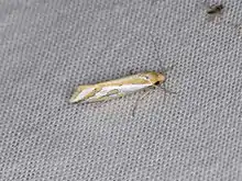 The wingspan is 19โ20 mm. The forewings are silvery white with bright orange markings. The costal edge is blackish near the base and there is a moderate streak immediately beneath the costa from the base to the costa before the apex and a rather broad dorsal streak, partly black edged above, from the base to the anal angle, attenuated posteriorly, leaving the inner margin slenderly white near the base only. There are two straight partially black-edged transverse streaks, the first from the subcostal streak at three-fifths to above the middle of the subdorsal but not nearly reaching it, suffusedly barred with blackish grey above the middle, the second from the extremity of the subcostal to the subdorsal before the extremity, suffused with blackish grey towards the costa and on a bar above the lower end. There are also a few blackish scales on the hindmargin. The hindwings are light grey, faintly yellowish tinged.[2]