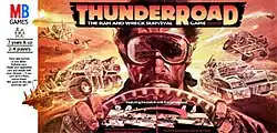 Thunder Road (a.k.a. ThunderRoad, Le Survivant)[1] is a post-apocalyptic themed racing board game invented by Jim Keifer and published by Milton Bradley. Using an assortment of four different vehicles each ranging from a modified dune buggy to a gyrocopter, players must race down an infinite roadway against one another. The goal of the game for players is to either be the last player team alive (e.g., eliminate all other player vehicle teams) or simply out race (i.e., out distance) the other teams. Although the game was originally published by Milton Bradley in 1986, Hasbro currently owns the rights to the game, since it acquired Milton Bradley in 1984 (though a modernized version, Thunder Road: Vendetta was released in 2023 by Restoration Games).[2][3]