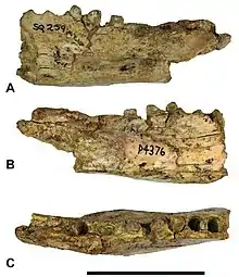 A species of Thylacinus, it was somewhat larger than the recent Tasmanian tiger Thylacinus cynocephalus, and similar weight to another late Miocene species Thylacinus potens, both of which are estimated to have been in a range of 38.7 and 57.3 kilograms.[2] The type material was exceptionally fragmented in its sandstone deposition at Alcoota, requiring the assembly of the dentary for examination and comparison. The first reconstruction of the specimen was modified by the describing author. Murray's reconstruction is of one larger and more robust dentition and palate than T. cynocephalus, but resembling the gracile and elongated snout, more so than the species T. potens.[1]