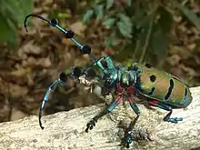 Thysia wallichii is a species of longhorn beetle (family Cerambycidae). It is typically 33–40 mm (1.3–1.6 in) long and native to the northern part of South Asia, southern China, Mainland Southeast Asia and the Greater Sundas.[1] It is the only species in the genus Thysia (though sometimes listed by the synonym Diastocera wallichii) and it was described by Hope in 1831.[2]