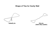 Ties in a cavity wall are typically made of iron, steel, or plastic; though figures are various. Basically, a tie has ring to fasten with mortar on both end like a bow. Ties would be selected by type of masonry, the cavity width, and so on.