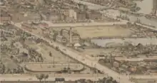 The street seen on a detail from a drawing by [Franz [Saive from 1897. Dantes Plads is visible in the upper left corner and a lumberyard can be seen in the bottom right corner