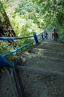 Previously, the temple had one stairway with 1,237 steps leading to the summit (see photo). The stairs have been recently updated with a rebuilt section and now has 1,260 stairs leading to the summit. Some of the stair risers are more than a foot (30 cm) high. The top of the stairs is 278 meters' elevation. Elsewhere on the compound, 184 steps lead to the foothills area where monks live in the caves. Monkeys roam the lower stairs and temple grounds. Occasionally people are bitten and require hospital treatment.[6]