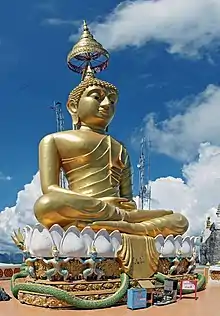 The Tiger Cave Temple (Thai: วัดถ้ำเสือ, RTGS: wat tham suea) is a Buddhist temple north-northeast of Krabi, Thailand. A sacred site, it is known for the tiger paw prints in the cave, tall Buddha statues and the strenuous flight of stairs to reach the summit.[1]