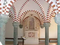 The church is a primitive Romanesque brick basilica; the original side-chapels were removed in the 14th century to make way for a new east end. The nave was vaulted in the Baroque period, and a new choir at the west end was added at the same time, as was a Baroque campanile. The conventual buildings are to the south of the church. The early Gothic chapter house in the east range has survived, with a square chapter room with nine bays from the early 13th century and symmetrical triforium windows looking onto the central courtyard and the site of the cloister, no longer extant, with the dormitory with bricked-up windows in the upper storey, as have the sacristy, the Fraternei and to the south the refectory building, as well as the lay brothers' block in the west, now converted for residential purposes. The entire precinct was renovated for the new community that took over the premises in 2000.