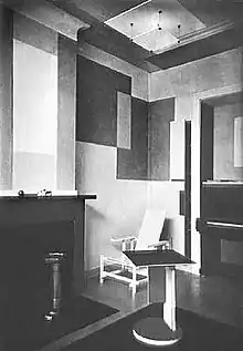 In her apartment in The Hague, the music room was designed by Vilmos Huszár and supplemented with unique furniture of Gerrit Rietveld. A White Chair was designed by Gerrit Rietveld as a special commission for Til Brugman in 1923. Before Dutch Chair Designer Gerrit Rietveld painted the Red and Blue Chair, he made several mono colored ones. In the room a multi-colored end table by Gerrit Rietveld was also included.