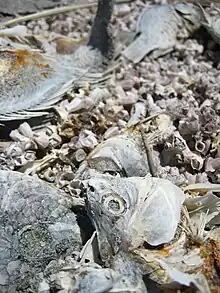 High salinity concentrations, algal blooms, agricultural runoff, hypoxia, wind events and temperature variability all contribute to fish die-offs in the Salton Sea. The high concentrations of tilapia in the Salton Sea (relative to other fish species) signify that tilapia often constitute the largest percentage of dead fishes during periods of excessive environmental stress. During fish kills, tilapia often wash ashore en masse.[32]