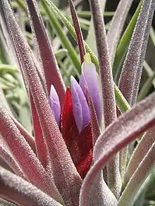Tillandsia kammii is a xerophytic epiphyte.[7] It is one of only four species of Tillandsia that is protected by the CITES Appendix II.[8] T. kammii has densely arranged leaves and often grows between five and ten centimeters tall. It has thin wiry roots and has been known to grow both as a single plant and in clusters. This plant has a short, bright red inflorescence, surrounded by violet petals, that rarely lasts more than a day after blooming. Unsurprisingly, this plant has a rough texture and appearance which is due to coarse trichomes covering its leaves. Tillandsia kammii closely resembles both T. velutina and T. plagiotropica. It is differentiated from the former by its larger, denser trichomes, and from the latter by its narrower, longer, and more flexible leaves.[5]