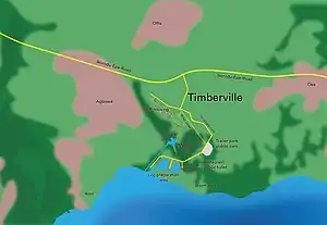 Apart from the sawmill with a band saw hall, Timberville includes a loading area (boom area), log preparation area, sales offices, trailer park, meeting hall, restaurant, police station, fire station, 160 2-bedroom terraced houses for employees, running water supply and public toilets. Vacated sawdust is pressed into pallets in a dedicated briquette plant to be sold to industry as heating fuel. It has a capacity of 1,500 tonnes per hour.[5][6]