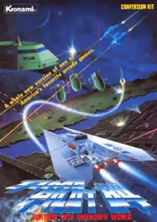 Time Pilot '84: Further Into Unknown World is a scrolling multidirectional shooter released in arcades in 1984 by Konami. The different time periods of 1982's Time Pilot are replaced by a top-down view of a science fiction landscape that varies in color and type of enemies.[1] It adds the ability for the player to launch guided missiles. Time Pilot '84 was primarily sold as a conversion kit for older games.[1]