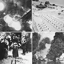 Clockwise from top left: Battle of the Bismarck Sea, graves of U.S. Marines killed in the Battle of Tarawa, burning Allied ships after the air raid on Bari in Italy, Jews of the Warsaw Ghetto