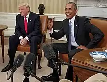 - ↑ Collinson, Stephen (November 14, 2016). "Obama urges Americans to give Trump a chance". CNN. Retrieved November 14, 2016.