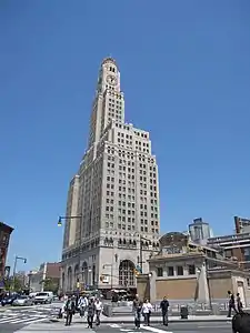 The Williamsburgh Savings Bank Tower, now 1 Hanson Place apartments. In the right foreground is the disused headhouse of Atlantic Avenue – Barclays Center subway station