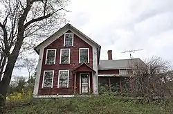 The Timothy Bancroft House stands in what is now a rural and isolated area of northern Harrisville, near the end of Bancroft Road. Set on a rise overlooking the former mill site, it is a 2+12-story wood-frame structure, with a gabled roof and clapboarded exterior. An older ell extends to the east, with its own central chimney. The styling of the house is Greek Revival, with wide cornerboards and a gabled hood over the entrance. A shed-roof porch extends across the front of the ell.[2]