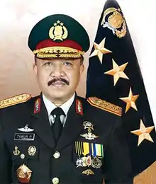 General Police (Ret.) Timur Pradopo (born 10 January 1955), DUBC was Chief of the Indonesian National Police (Kapolri) from 22 October 2010 until 25 October 2013.[1] Timur Pradopo replaced Chief of Police General Bambang Hendarso Danuri who was relieved of duty. He was nominated by Indonesian President Susilo Bambang Yudhoyono.