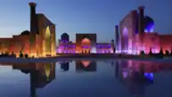 Timurid architecture started with the sanctuary of Ahmed Yasawi in present-day Kazakhstan and culminated in Timur's mausoleum Gur-e Amir in Samarkand. Timur's Gur-I Mir, the 14th-century mausoleum of the conqueror is covered with "turquoise Persian tiles".[27] Nearby, in the center of the ancient town, a "Persian style madrassa" (religious school)[27] and a "Persian style mosque"[27] by Timurid Sultan Ulugh Beg is observed. The mausoleums of Timurid princes, with their turquoise and blue-tiled domes, remain among the most refined and exquisite Persian architecture.[28]