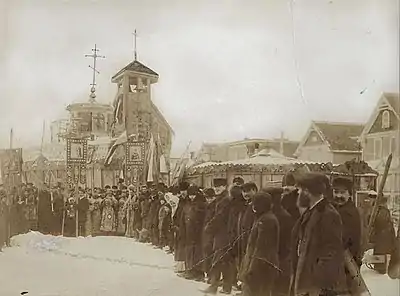 Genik, Bodrug, and Negrich moved quickly to try to secure their community.[8] They brought in Seraphim. He arrived in Winnipeg in April 1903[9] to set up a Church that was independent of any churches in Europe, and would have no loyalty to any of the religious interest groups vying for the souls of the new Ukrainian immigrants on the prairies. To their satisfaction, Seraphim set up an Orthodox Russian Church (not Russian Orthodox)[N 1] of which he declared himself the head, and to placate the Ukrainians it was also called the Seraphimite Church. He provided the parishioners with an Eastern Rite with which the immigrants were familiar, began to ordain cantors and deacons, and "…on 13th December 1903, a small frame building on the east side of McGregor Street between Manitoba and Pritchard Avenues, that may have been called the Holy Ghost church, was officially blessed by Seraphim and opened for worship."[10] "In November 1904 he started building his notorious 'tin can cathedral' at the corner of King Street and Stella Avenue,…"[10] made of scrap metal and wood. Charismatic, Seraphim "…ordained some 50 priests and numerous deacons, many semi-illiterate, who carried out priestly duties throughout the [Ukrainian] settlements, preaching independent Orthodoxy and trustee ownership of church property. In two years this church claimed nearly 60,000 adherents…"[11]