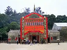 Tin Hau Temple, Chek Lap Kok (東涌赤鱲角天后宮) Built in 1823 at the north east of Chek Lap Kok. The entire temple was built of granite quarried on the island.[18] Repaired in 1978.[14] Dismantled in 1991 because of the construction of the new airport, and rebuilt in 1994 at its present location.[9][19] |