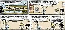 - Tina’s imperfections, if she has any, are of the kind that are quirky, and therefore endearing. This is good for a cartoon character. I believe the main character of a comic strip should be one that’s likable. But does that mean the main character should be flawless? It’s the weaknesses, or fixations, that make characters interesting. The other characters of the strip all have fixations that make them imperfect. Rob, the manager of Pepper’s Restaurant, is a misfit neat/control freak who hasn’t yet realized that it’s now cool to be a geek. Carlos is a sack of testosterone who must prove himself to be the manliest at any cost. Suzanne is a spoiled 30 something flake who has so many weaknesses she’s created a personality out of being less than perfect. And then there’s Monica. If you read the strip then I don’t have to waste my words on Monica. Tina stands apart. One good reason for this is that Tina is what’s known in the comedy world as the “Straight Man”. She’s the only sane character in a world of insanity. In the strip she represents logic, the voice of reason, while every one else is crazy. This is where most of the humor comes from.[10]