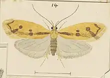♀. 17 mm. Head, thorax light ochreous-orange. Palpi whitishochreous. Forewings elongate, slightly dilated, costa gently arched, apex obtuse-pointed, termen rounded, oblique; golden-ochreous-orange; markings ochreous-brown; stigmata forming rounded spots, plical somewhat beyond first discal, a rather narrow sinuous streak proceeding from near base along fold between these and touching second discal beneath, thence directed to tornus, some scattered scales between this and narrow bent bar crossing wing near apex and continued along termen to tornus: cilia orange-yellow. Hindwings grey; cilia whitish-grey.[3]