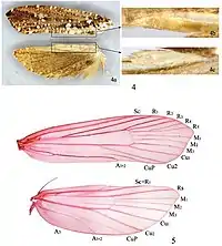 Wings of T. indica, ♂. 4 Wings and patches: 4a wings; 4b oval patch; 4c rough scale patch; 5 Venation, slide No. NKYLL012