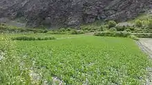 Potato, green peas and cauliflower are the main agricultural items here. Sea buckthorn trees grew naturally here but now are being planted by villagers also. Sea buckthorn(Hippophae salicifolia) studied in the Tinno village are best for the commercial cultivation because it bears few thorns and have bigger fruit size(28-32g/100 fruit).[4] Other vegetation includes Betula utilis(bhojpatra), juniper, eucalyptus tree and willow trees. Fields are being irrigated through sprinkler system and through PVC pipes. Old system of flow channel is now outdated.