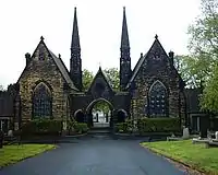 The entranceway to the cemetery is flanked by a pair of Grade II listed Gothic style chapels, where services can be held prior to the burial. Other listed structures in the cemetery include the lodge, gateway and boundary wall and a war memorial, 250m east of the chapel.[2][3][4]